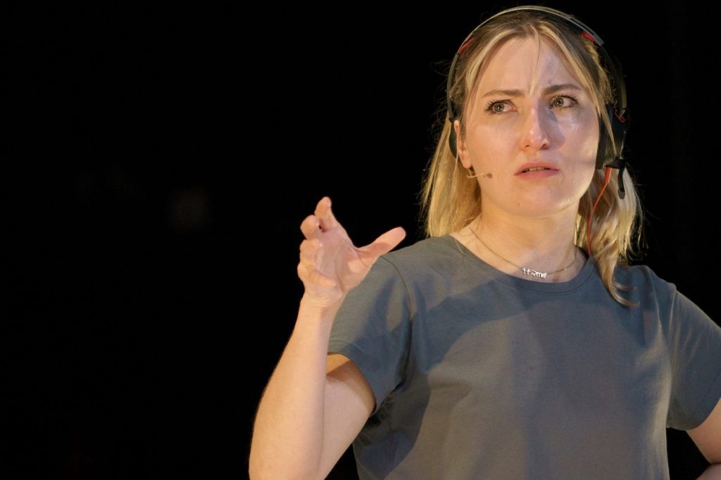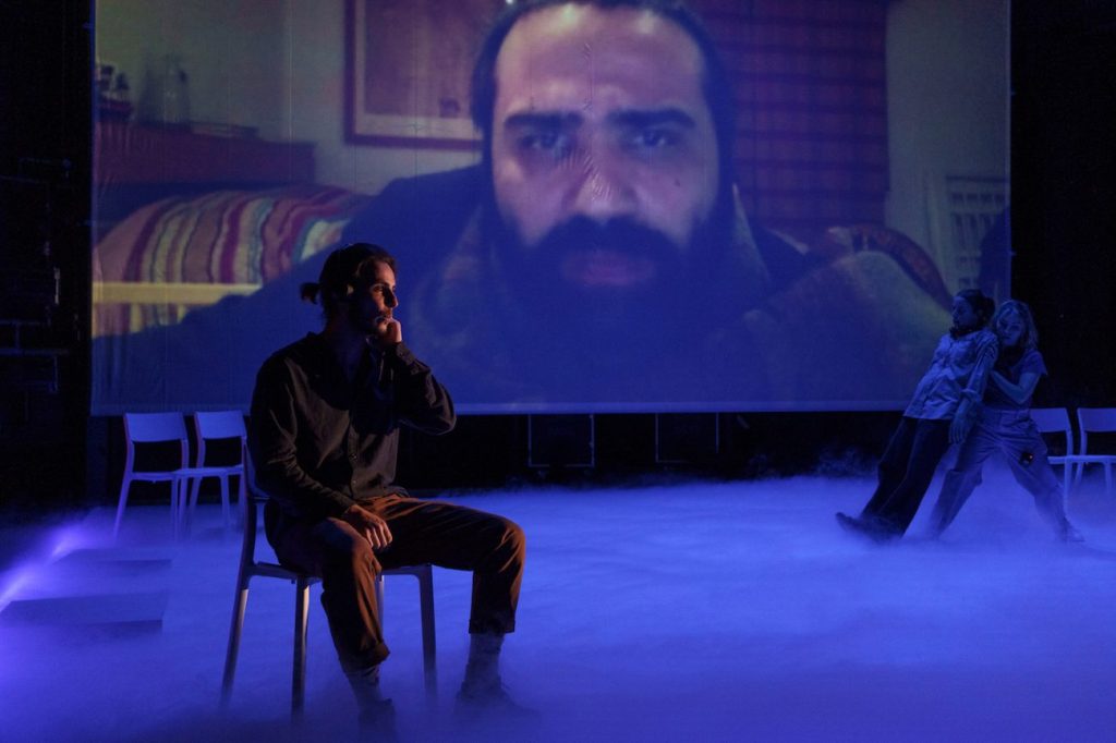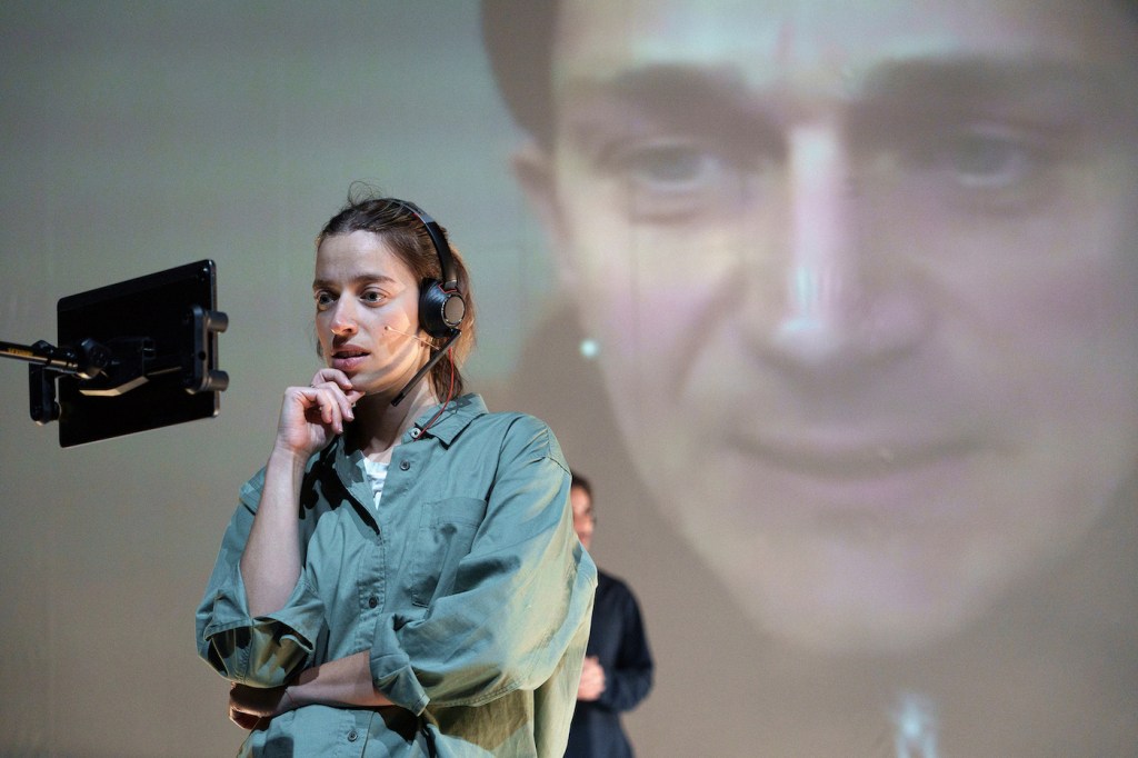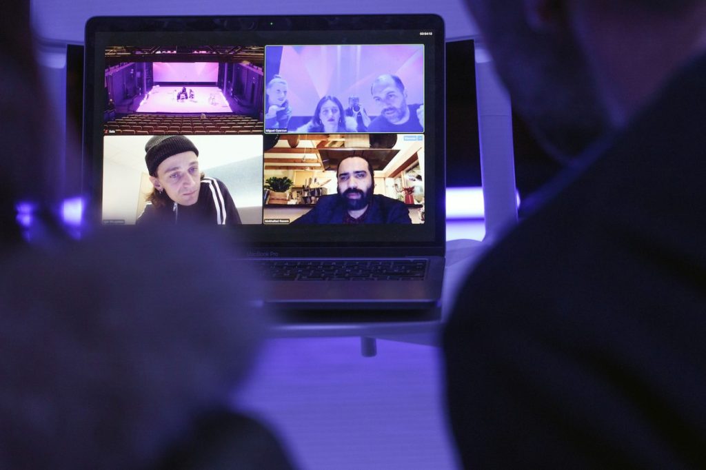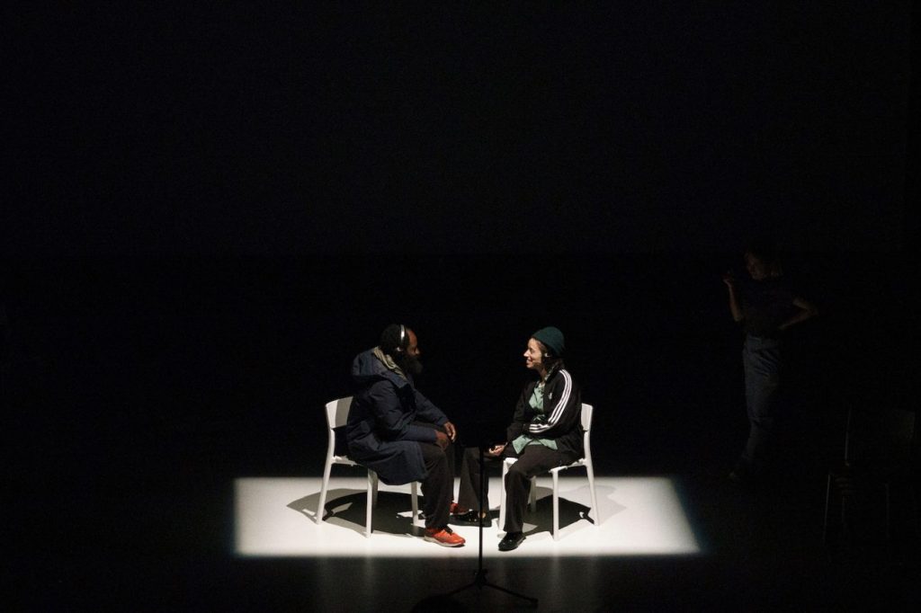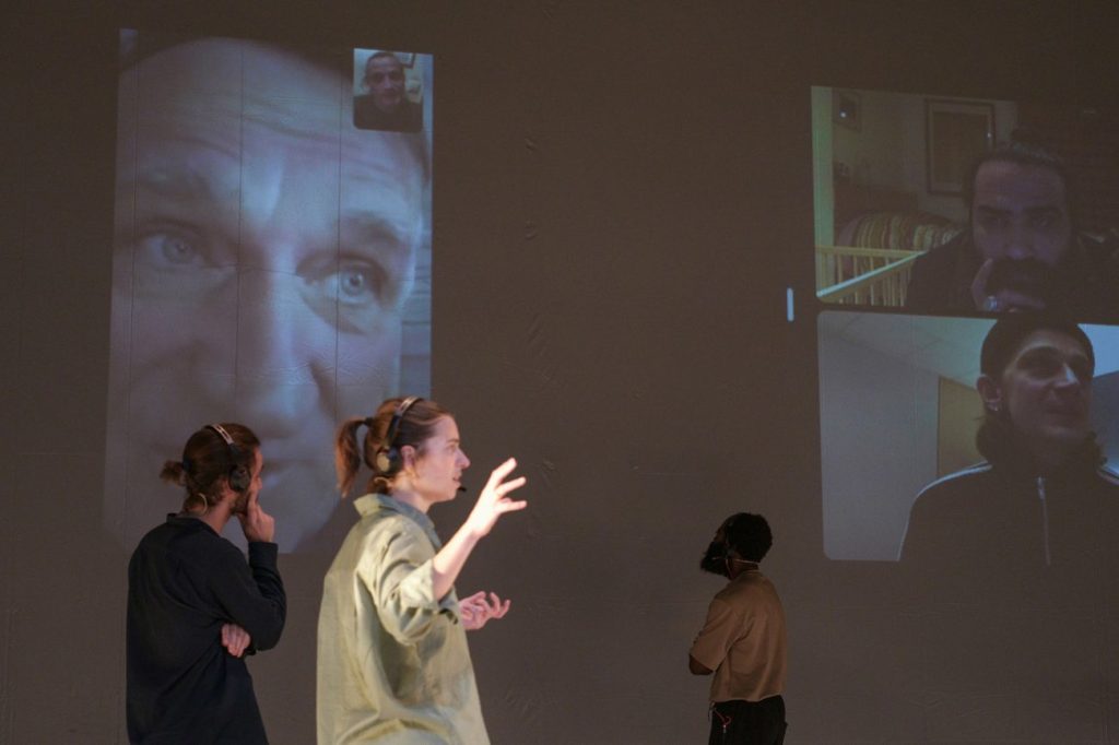 El público ve de manera simultánea el encuentro en pantalla y su representación física/ su encarnación presencial. Los protagonistas hablan en su lengua materna y sus palabras son traducidas por los actores en escena. Trabajan en traducción simultánea, traduciendo el dialogo según sucede, en un ejercicio de verbatim en tiempo real.